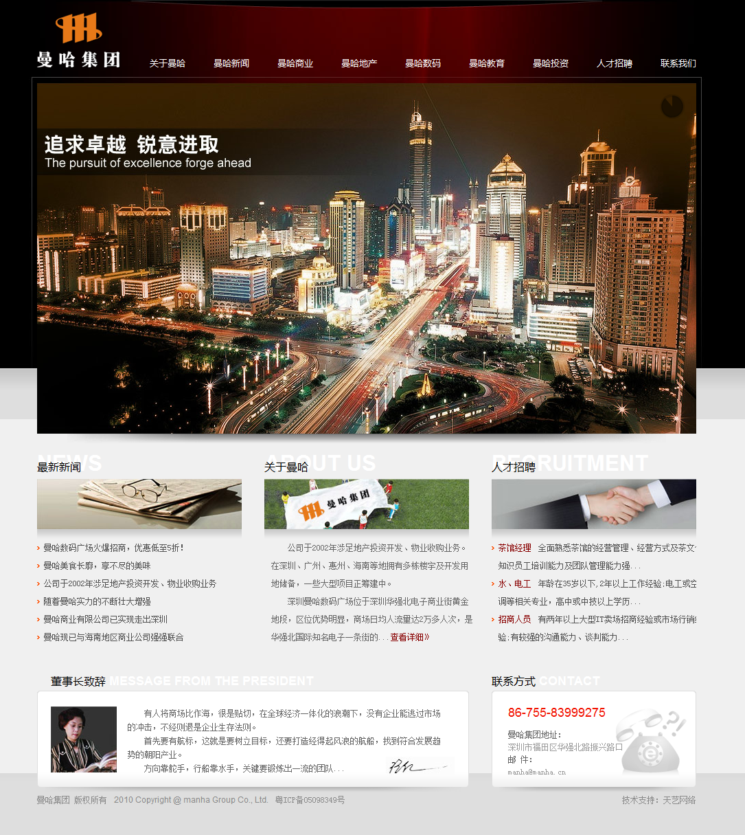 深圳市曼哈公司始成立于1995年,由美国西雅图泛太平洋投资公司参股组建。经过十多年的发展,经营范围己覆盖零售百货、数码通讯、房地产开发、租赁与物业管理、文化教育等领域。 下属的深圳市曼哈商业有限公司,拥有曼哈数码广场经营面积达5万平方米,其中包括全国电器零售巨头苏宁电器的加盟,并把曼哈分店作为旗艇店,是深圳较有影响的老字号大型商业终端机构,多年来在深圳特区消费者心目中是一面时尚的旗帜;经营面积达5000平方米的曼哈通讯数码广场雄驻华强北中央,成为华强北这一国际知名的电子一条街重要组成部分。 在教育领域,曼哈投资兴办的曼哈幼儿园己成为深圳教育界的翘楚。作为公司发展战略的需要,公司于2002年涉足地产投资开发、物业投资业务,在深圳、广州、惠州、海南等地拥有多栋楼宇及开发用地储备,一些大型项目正运筹中。 曼哈公司以“服务大众,回馈社会”为经营理念,以“整合资源,双赢共荣”为合作准则,以“追求卓越,锐意进取为企业精神,在二十一世纪南粤改革开放的前沿,必将铸就新的辉煌!